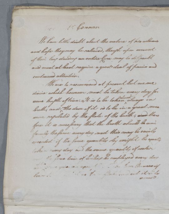 Case of Mr Cannan who is to take a medicine in beef broth and follow a regimen for an unstated complaint (directions suggest it may possibly be gravel). |