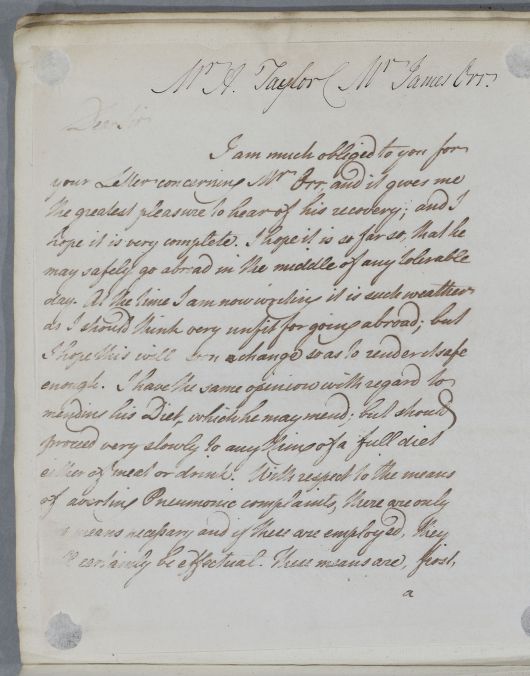 Reply to Mr Taylor regarding Mr James Orr and his recovery. Cullen recommends measures for 'averting Pneumonic complaints' and suggests that if Taylor requires further detail, 'I can give you very full instruction by sending you a Dissertation produced by one of my sons' (Archibald Cullen's dissertation De Frigore, Ejusque Vi Et Effectibus in Corpus Humanum (1780) (For Taylor passing on information in the the dissertation to James Orr see his response in Doc ID 2211). William Orr is also mentioned briefly.