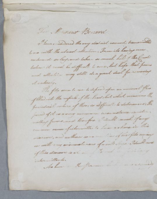 Case of Mons. Benard at Dunkirk who has a susceptibility to coughs and cold a 'bastard peripneumonary'. In 1786 he is having 'fits'. The letters were mistakenly associated with Gregory as the patient. |