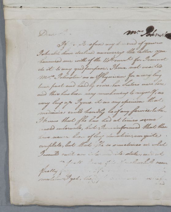 Reply, 'Mrs Johnston'. ullen writes that he has not visited her recently, certainly not since her sisters visited. She has frequent severe fits of melancholy, and her case is 'at times of absolute insanity', but her husband is as attentive and indulgent as her condition allows. However, 'as a Constitutional disease', Cullen cannot think of measures to prevent recurrences.