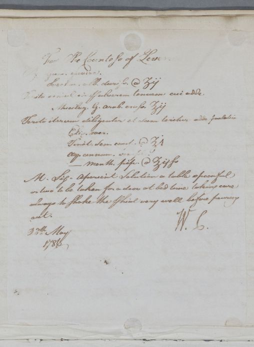 [ID:5274] From: Dr William Cullen (Professor Cullen) / To: Dr Robert Menzies (of Dura ) / Regarding: Countess Wilhelmina Leslie (Nisbet) (Countess of Leven & Melville, Lady Leven) (Patient) / 28 May 1786 / (Outgoing)