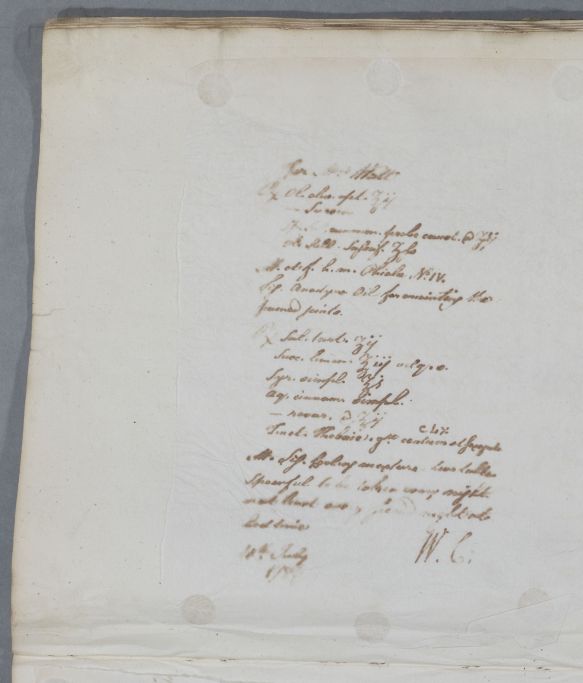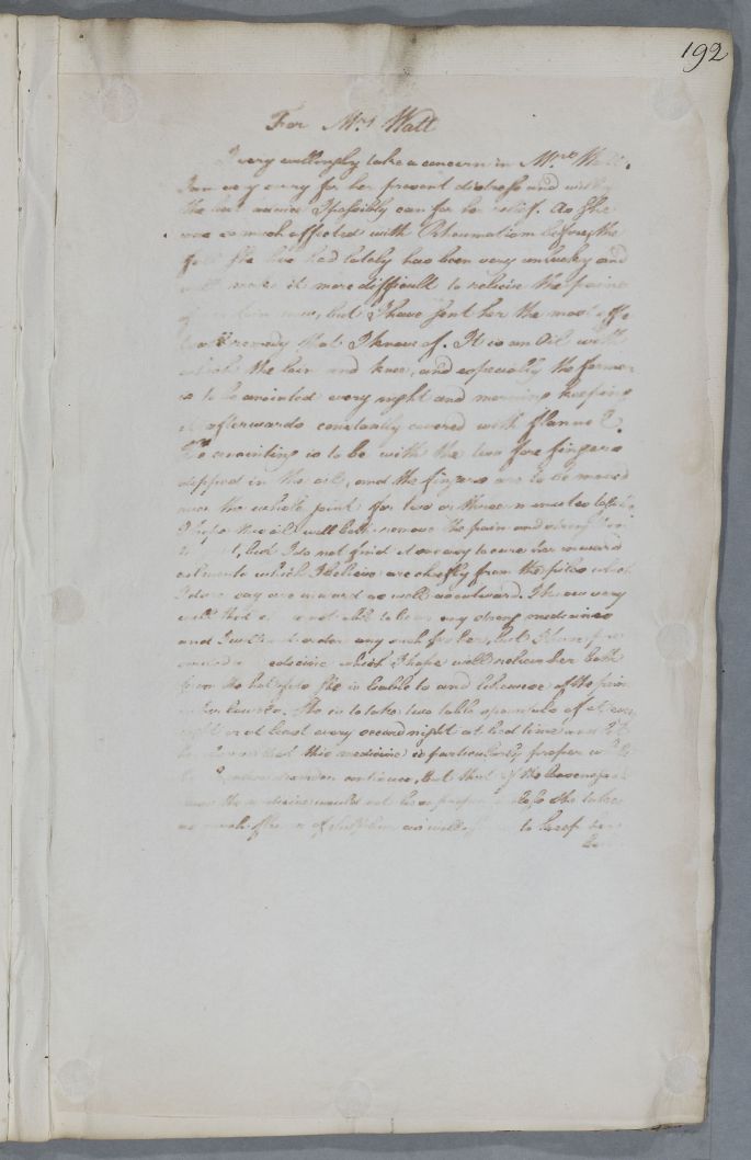 | Summary | Reply, 'For Mrs Watt'. The letter is probably addressed to her relative, Robert Brown. Cullen sends prescriptions, with advice on anointing her painful joints and on treating her heats and abdominal pains, which he believes to be caused by her piles. He wishes to hear from her directly, writing: 'if Mrs. Watt will be pleased to write me soon an account of her state for the time I shall certainly without any further fee most willingly advise her as well as I can'. |