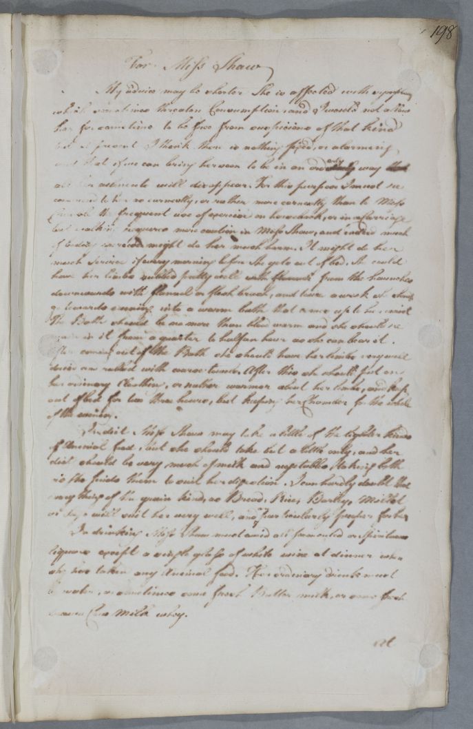 | Summary | Reply headed 'For Miss Shaw', addressed to a woman concerning her 2 sisters (sisters-in-law?). The main patient, Miss Shaw, is threatened with a consumption, and there is mention of Miss Crimble and Mrs Perry, as Docs ID 5297 and 5299 seem to be enclosed with this, possibly the result of a group visit from these ladies. Poor copy. |