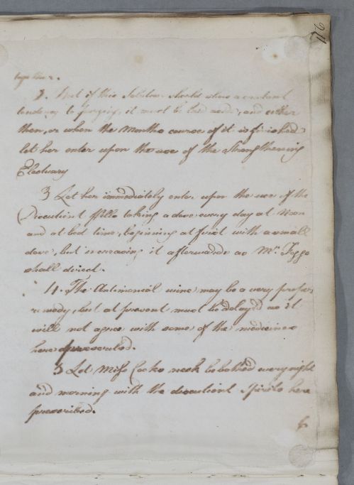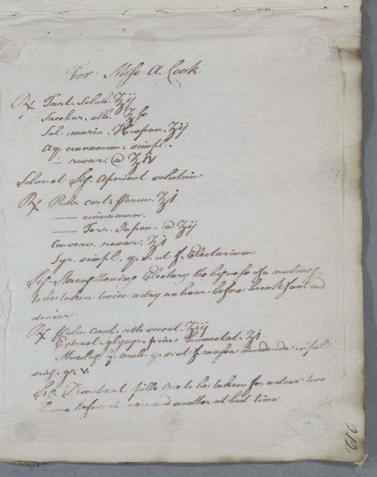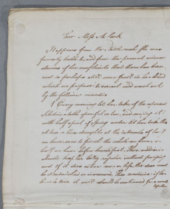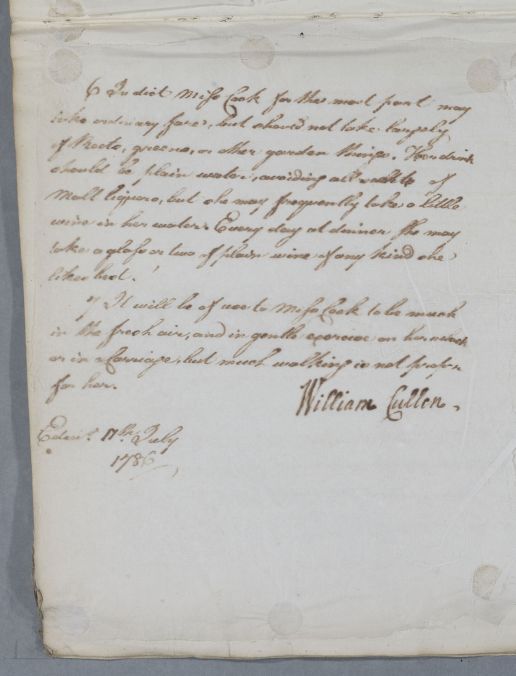 | Summary | Reply 'For Miss A. Cook', to an unnamed physician. Cullen ascribes her ailments to 'some fault in her blood'. He provides a regimen, for medicines, diet and bathing her neck, with several prescriptions. These are to be administered under Mr Fogo's direction. |