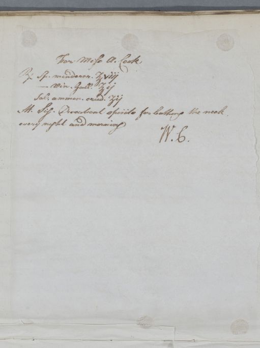 Reply 'For Miss A. Cook', to an unnamed physician. Cullen ascribes her ailments to 'some fault in her blood'. He provides a regimen, for medicines, diet and bathing her neck, with several prescriptions. These are to be administered under Mr Fogo's direction.