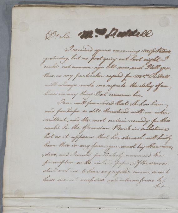 Letter concerning the case of Miss Riddell, who 'has been and perhaps is still threatened with an intermittent', and Mrs Dorothy Riddell (probably her aunt), for whom Cullen prescribes a febrifuge, and whom he advises to leave Swinburne Castle if it is in a marshy or agueish area, for somewhere drier. The intended recipient may be Dr Jefferson, who attends the Riddells of Swinburne in other correspondence.