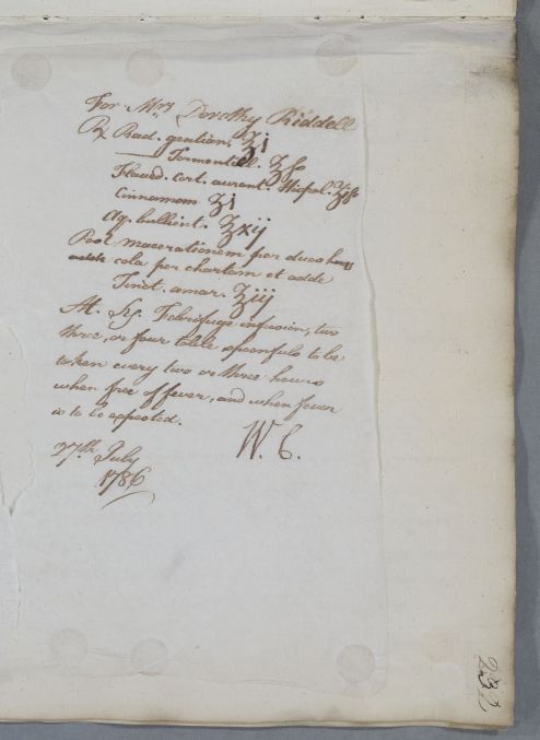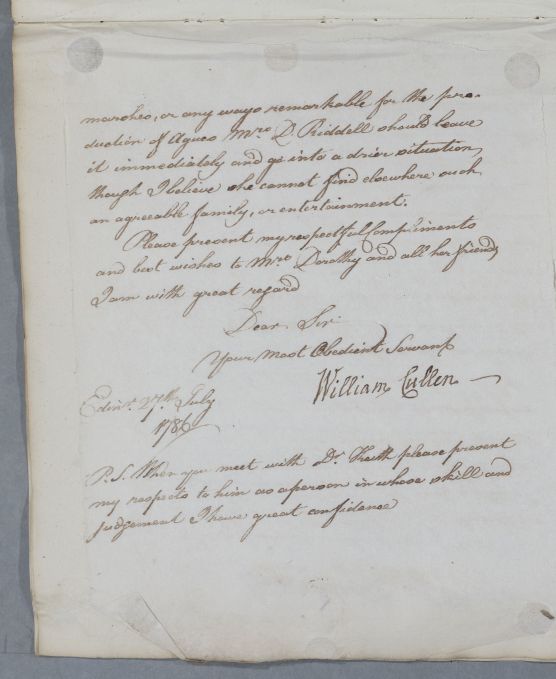 [ID:5313] From: Dr William Cullen (Professor Cullen) / To: Dr Thomas Jefferson / Regarding: Mrs Dorothy Riddell (Patient), Miss Mary? Riddell (Patient) / 27 July 1786 / (Outgoing)