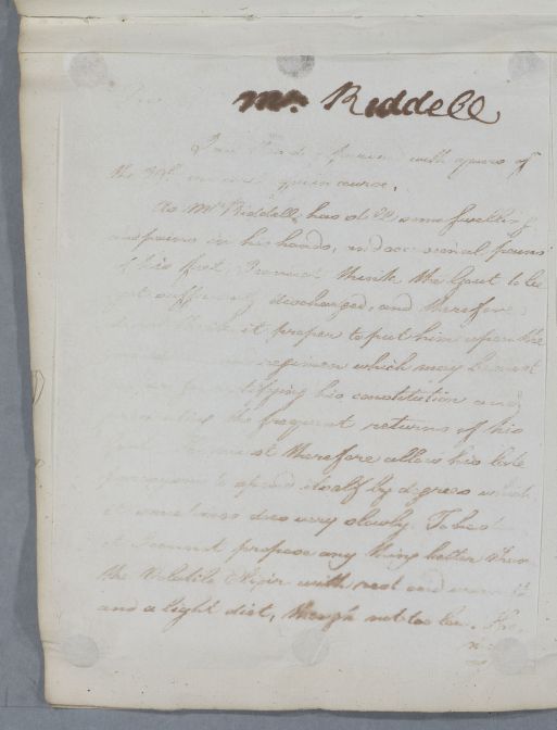 Case of Mr Riddell at or near Hexham, whose complaints include pains in his hands and salivating excessively, all symptoms Cullen attributes to a 'gouty' disposition. |