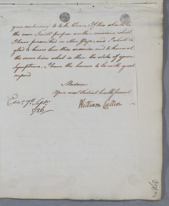 [ID:5331] From: Dr William Cullen (Professor Cullen) / To: Mrs Margaret Johnston (Stewart) (of Cowhill) / Regarding: Mrs Margaret Johnston (Stewart) (of Cowhill) (Patient) / 7 September 1786 / (Outgoing)