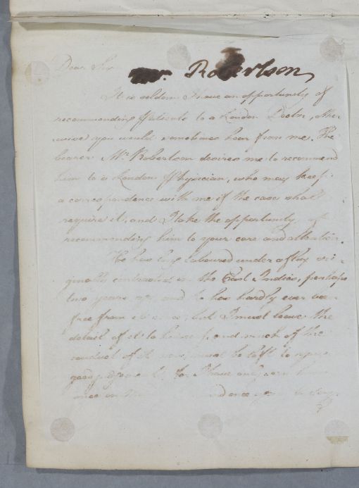 Reply concerning the case of Mr Robertson. The addressee is almost certainly the London physician David Pitcairne who Cullen had known in London when young; Cullen begins by saying 'It is seldom I have an opportunity of recommending patients to a London Doctor, otherwise you would sometimes hear from me'. Letter to be delivered by the patient, Robertson.
