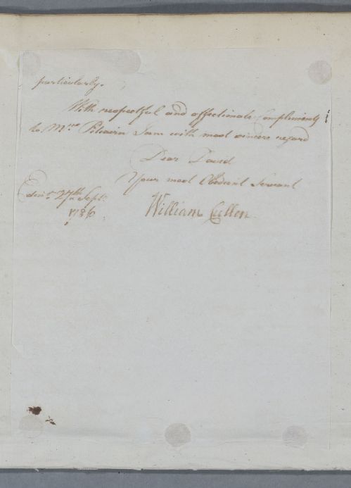 | Summary | Reply concerning the case of Mr Robertson. The addressee is almost certainly the London physician David Pitcairne who Cullen had known in London when young; Cullen begins by saying 'It is seldom I have an opportunity of recommending patients to a London Doctor, otherwise you would sometimes hear from me'. Letter to be delivered by the patient, Robertson. |
