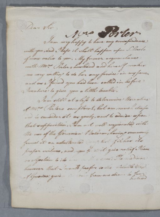 Reply to Dr Fenwick concerning the case of Mrs Porter, whose condition Cullen believes to be 'gouty'; Cullen mentions his 'former acquaintance with Mrs Porters husband and herself'.