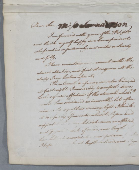| Summary | Letter concerning the case of Miss Saunderson, in response to 'yours of the 8th Septr.' but might be a mistake for the 9th. or 19th. |