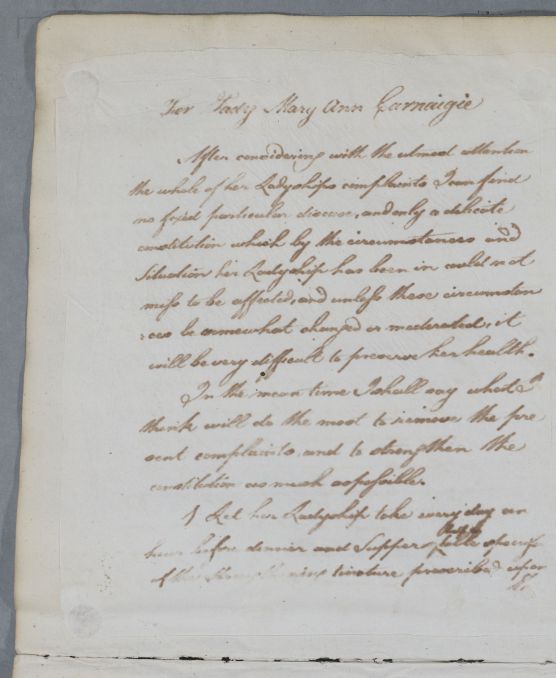 Case of Lady Mary Anne Carnegie, daughter of Lord Northesk who is advised for her 'weak and delicate constitution'. |
