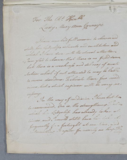 Case of Lady Mary Anne Carnegie, daughter of Lord Northesk who is advised for her 'weak and delicate constitution'. |