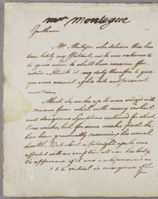 | Summary | Letter concerning the case of Mr Montague. Addressees dentified in the next letter as 'Messrs. Olive and Hollingsworth' (possible lawyers) 'Mr Montagu who delivers this, has been lately my Patient, and he now returns to be yours when he shall have occasion for advice'. |