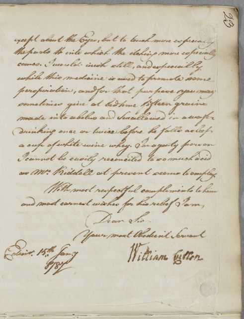 [ID:5392] From: Dr William Cullen (Professor Cullen) / To: Dr Thomas Jefferson / Regarding: Mr Thomas Riddell (of Swinburne Castle) (Patient) / 15 January 1787 / (Outgoing)