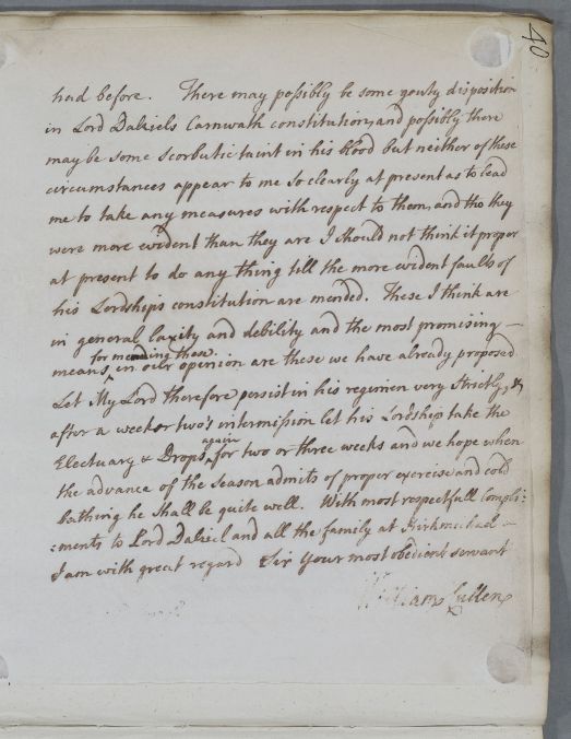 | Summary | Letter for Lord Dalziel, whose condition Cullen is sorry to hear has not improved. He mentions an apparent discussion with Mr Wood, and says that although the patient may have a gouty disposition or 'some scorbutic taint in his blood', the more evident faults of his constitution are laxity and debility. Recommends exercise and cold bathing. |