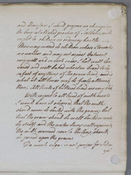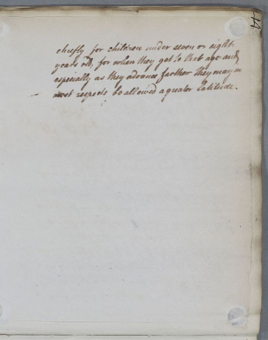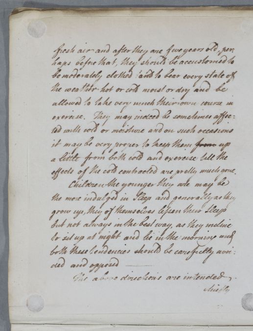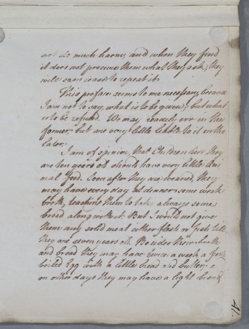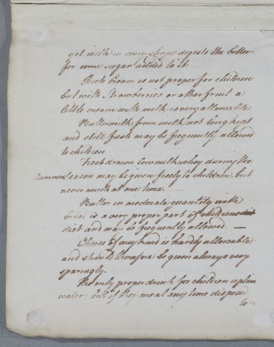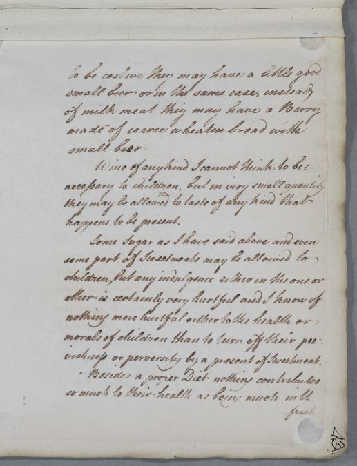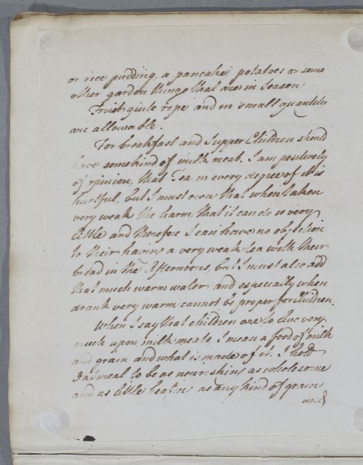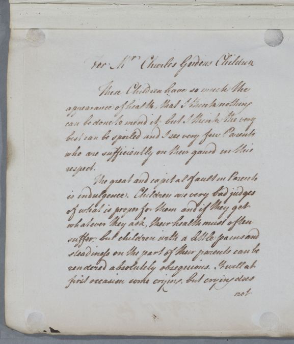 Letter 'For Mr Charles Gordons Children'. Cullen says they 'have so much the appearance of health, that I think nothing can be done to mend it', but since 'the very best can be spoiled' he gives recommendations to ensure their good health continues - 'I see very few Parents who are sufficiently on their gaurd [sic.] in this respect'. The greatest fault of parents, as Cullen sees it, is indulgence, and his recommendations are largely concerned with dietary restrictions.