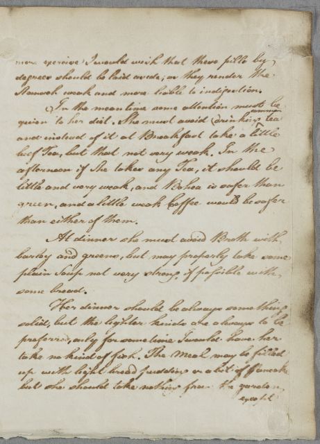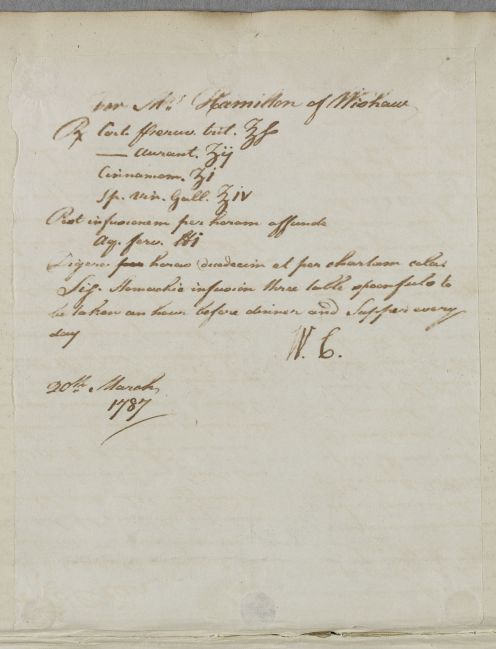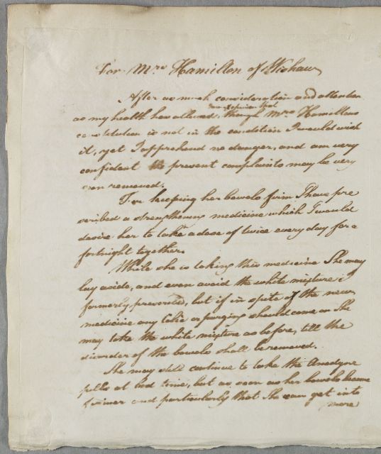 Reply, 'For Mrs Hamilton of Wishaw'. To keep Mrs Hamilton's bowels firm, Cullen prescribes a recipe for a strengthening mixture, which is enclosed at the end of this letter. He also advises on diet and exercise.