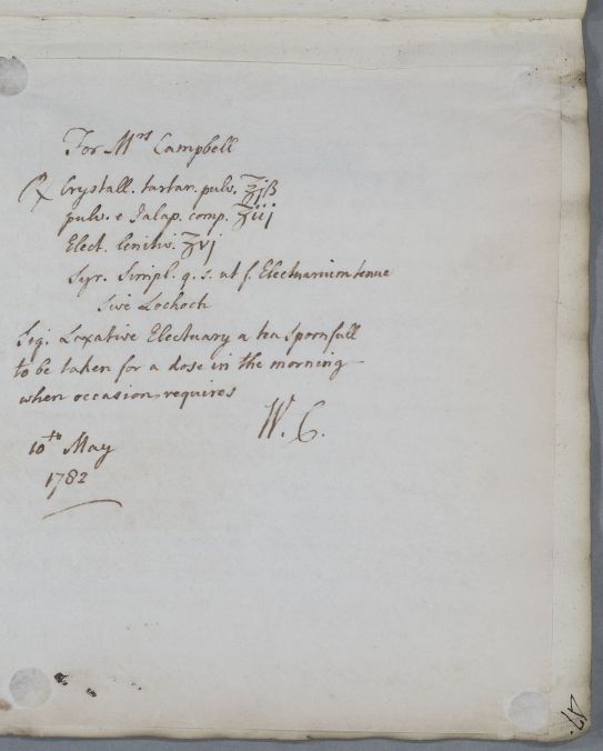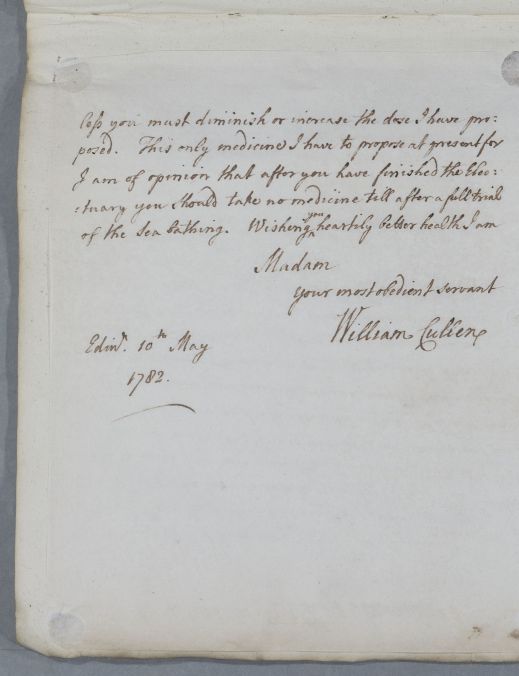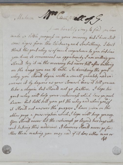| Summary | Reply, for 'Mrs Campbell of G.'. Cullen is sorry to hear that her recovery has progressed so little, but hopes that a laxative electuary and sea bathing will remedy that. |