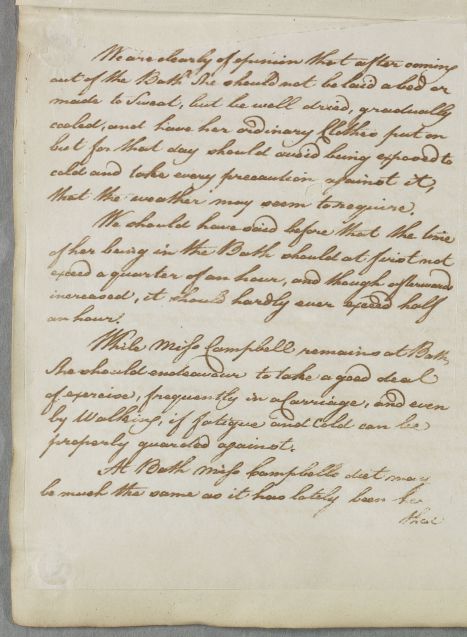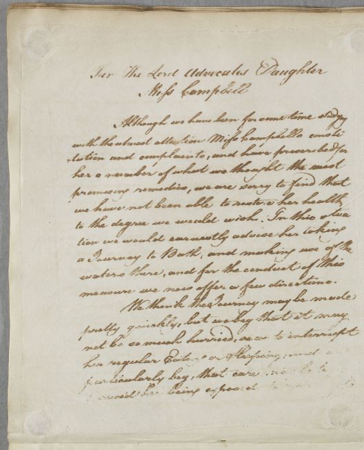 Case of Miss Campbell, eldest of the six daughters of Ilay Campbell, the Lord Advocate (later Lord Succoth), who is advised to go to Bath. |