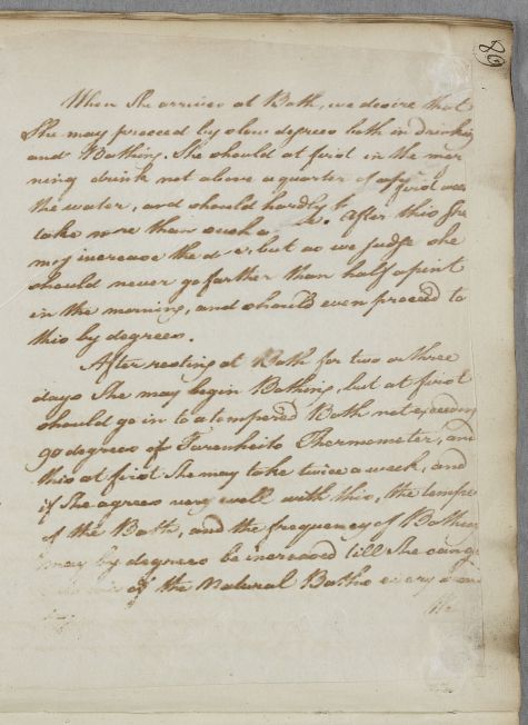 Reply headed 'For the Lord Advocates Daughter Miss Campbell', pp.89-90. Advice on taking the waters, internally and externally, when she goes to Bath. Her designation suggests she is Jean, the eldest of the six daughters of Ilay Campbell, later Lord Succoth. Her grandfather, Archibald Campbell of Succoth, is also Cullen's patient.