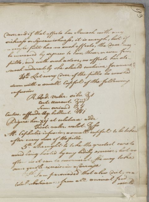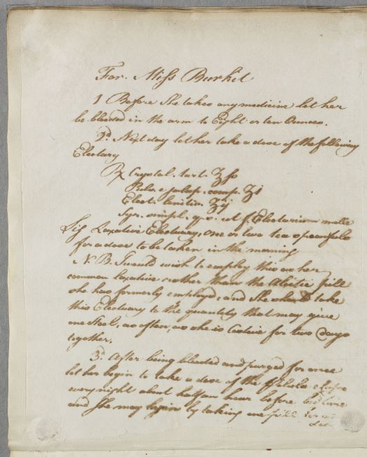 Case of Miss Burkit whose unstated symptoms require bleeding, purging, a 'low' regimen and an electuary. |