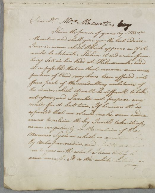 Case of the son of Mr and Mrs McArthur, 'affected with convulsive startings' after being 'placed upon his head by some other boys in imitation of Tumblers who at that time were in that Place'. |