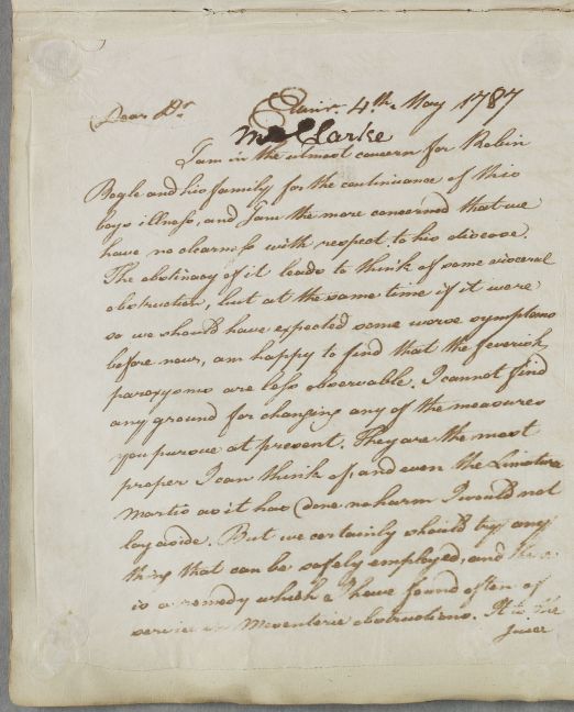 [ID:5448] From: Dr William Cullen (Professor Cullen) / To: Dr Alexander Stevenson (Professor; of Dalgairn ) / Regarding: Mr Clerke (Clark, Clarke, little Clark) (Patient) / 4 May 1787 / (Outgoing)