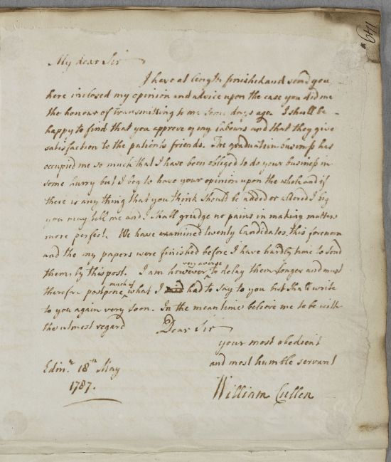 | Summary | Reply to an unnamed male correspondent, in form of a cover-note for a response (not immediately present) concerning an unnamed patient. Cullen apologises for his delayed response to a request for advice which is due to his graduation duties. Probably the cover letter for Document ID:5460, a very substantial response concerning a 'Chevalier" who is mentally disturbed. This association is supported by Cullen's allusion to the 'patient's friends' in the cover-note, a phrase which elsewhere invariably implies that he is addressing interested parties in a case of mental disturbance. |