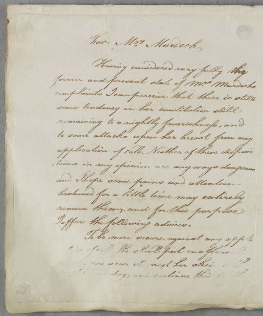 Case of Amelia, wife of George Murdoch, who now has tumours on her legs and a cold (following an earlier Case:1637). |