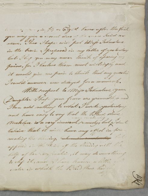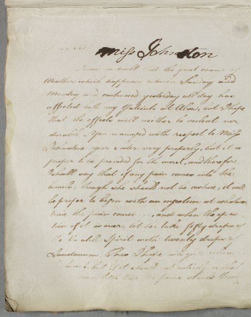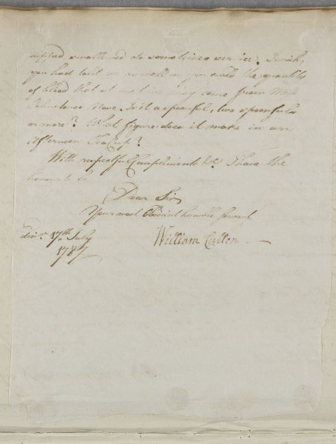 | Summary | Letter to John Johnstone of Alva, concerning the case of his sister and his daughter, both Miss Johnstone. Cullen now advises the use of an injection to relieve the elder Betty's bowels, as well as the laudanum. For little Betty's nosebleeds, he writes that 'the Blood stone necklace is a very innocent remedy, but more certainly I dont believe that it will have any effect in preventing the bleeding': however, 'with the help of her imagination, it may do something to stop it', and he has heard that making patients drink water into which the bloodstone has been dipped may work. He asks for more information as to how much blood she is losing via her nose. |