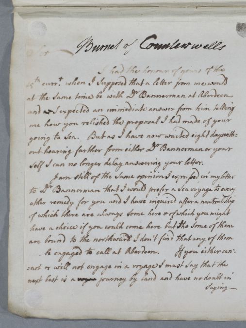 | Summary | Reply, 'Burnet of Counterswells', mentioning also a Dr Bannerman of Aberdeen to whom Cullen had written about Burnet's case previously. Cullen repeats that he 'would prefer a sea voyage to every other remedy for you', and says that he has inquired after a neutral ship himself. |