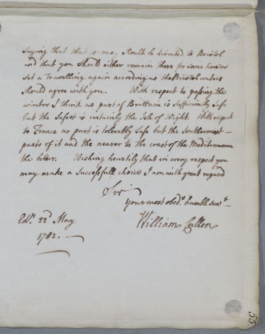 [ID:549] From: Dr William Cullen (Professor Cullen) / To: Mr James Burnet (Burnett, of Countesswells) / Regarding: Mr James Burnet (Burnett, of Countesswells) (Patient) / 22 May 1782 / (Outgoing)
