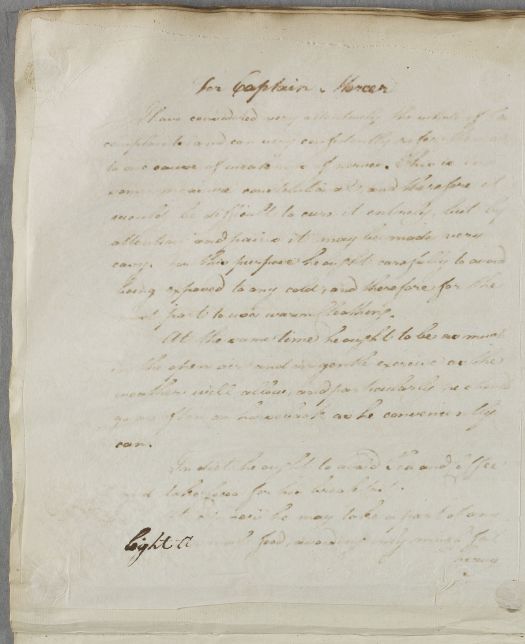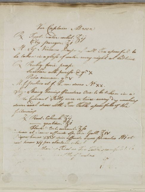 | Summary | Reply headed 'For Captain Mercer'. Advice for his nervous weakness and for diet and lifestyle. Prescriptions are included for medicines for use when he is settled in London. |