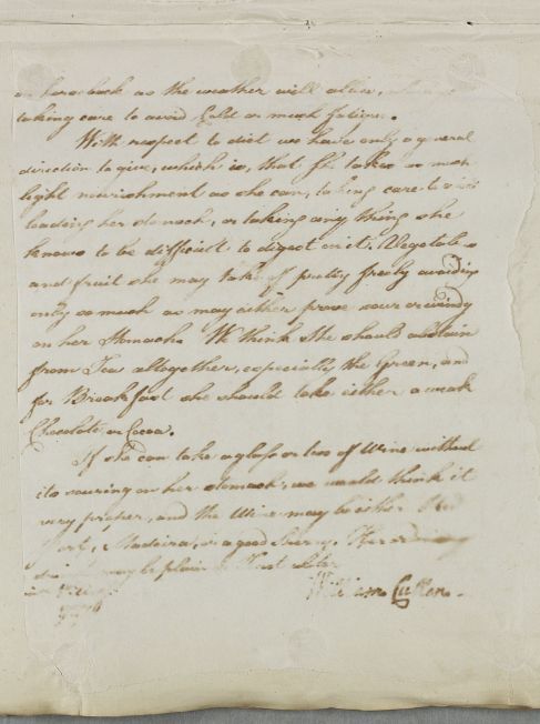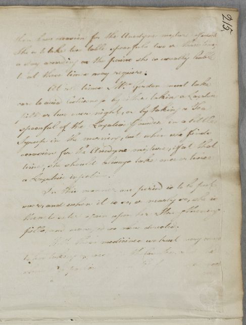 Letter concerning the case of Mrs Baron Gordon (Mary Baillie, wife of Baron Cosmo Gordon of Cluny). Cullen writes that 'We are much disappointed in Mrs Gordons stomach not bearing one of the most effectual medicines we could think of', and advises further on strengthening and laxative medicines, and anodynes, for her period pains. First page is a poor copy.