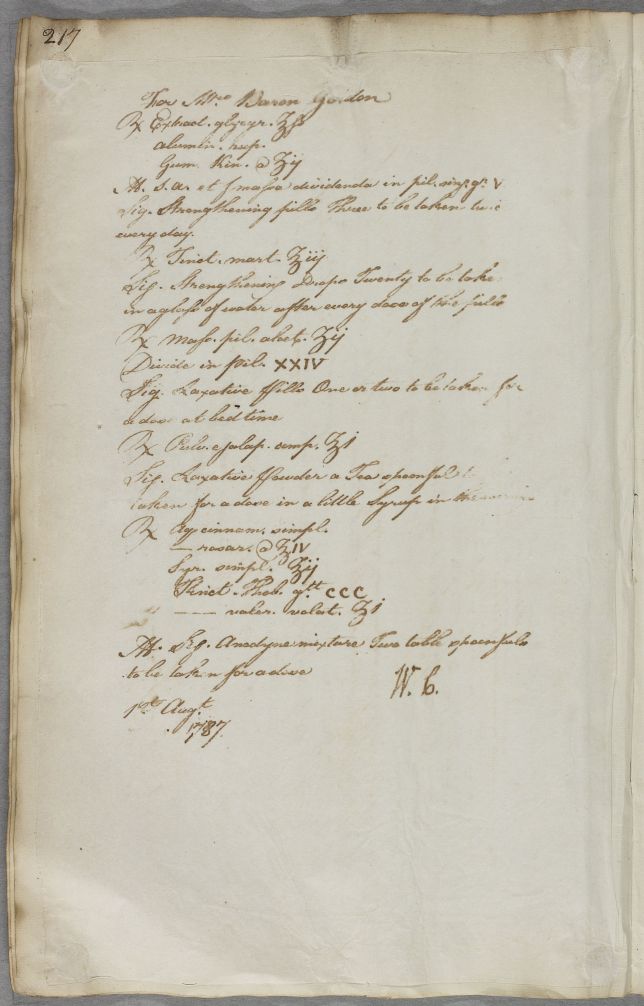 [ID:5500] From: Dr William Cullen (Professor Cullen) / To: Anonymous / Regarding: Mrs Mary Gordon (Baillie) (of Cluny; Mrs Baron Gordon) (Patient) / 1 August 1787 / (Outgoing)