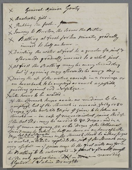 | Summary | Unsigned and undated rough note for a final version ([DOC ID:5501]) sent out later that day. Indexing on reverse gives the case as Lady Dumfries (or possibly the Dowager Countess, not current one, according to [DOC ID:5501], a patient of Dr Spence. She is recommended to go to Buxton and take the waters internally and externally for gout. Some medicines for the stomach are suggested. |
