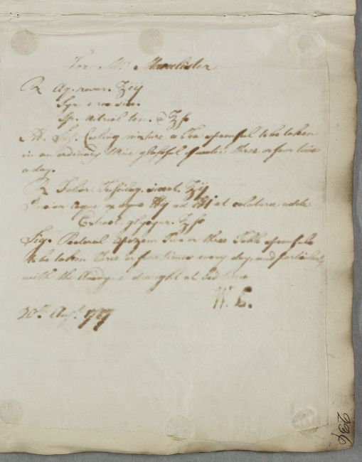 [ID:5510] From: Dr William Cullen (Professor Cullen) / To: [ADDRESSEE UNKNOWN] / Regarding: Mrs McAlister (M'Alister, Macalister, McAlister, McAlester) (Patient) / 20 August 1787 / (Outgoing)