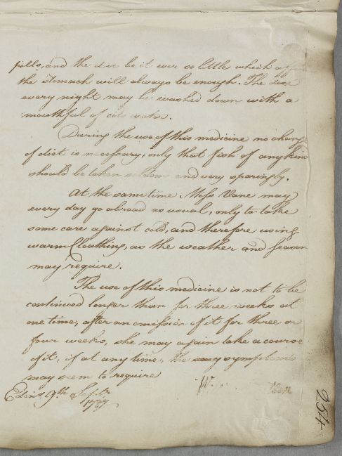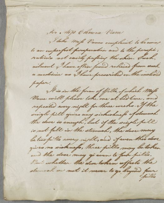 | Summary | Reply headed 'For Miss Elenora Vane', whose complaint is ascribed to 'an imperfect perspiration' and 'the perspiration's not easily passing the skin'. Diaphoretics are prescribed. |
