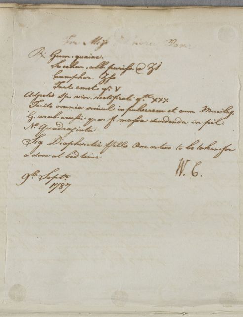 [ID:5520] From: Dr William Cullen (Professor Cullen) / To: Dr / Regarding: Miss Elenora Vane (Eleanor?) (Patient) / 9 September 1787 / (Outgoing)