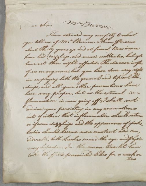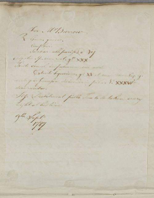 | Summary | Reply to Alexander Mollison, concerning Mr Burrow, the Collector of Customs at Port Glasgow. Cullen approves of the treatment given so far for his 'dazzlings' and 'musci [sic] volitantes'. In the postscript he advises that 'I formerly had dealings with Mr. Burrow know he is not a regular Payer, but now I shall depend upon you.' (Recipe is mirror-image on the back of the 2nd page, but also on a separate sheet on the next page). |
