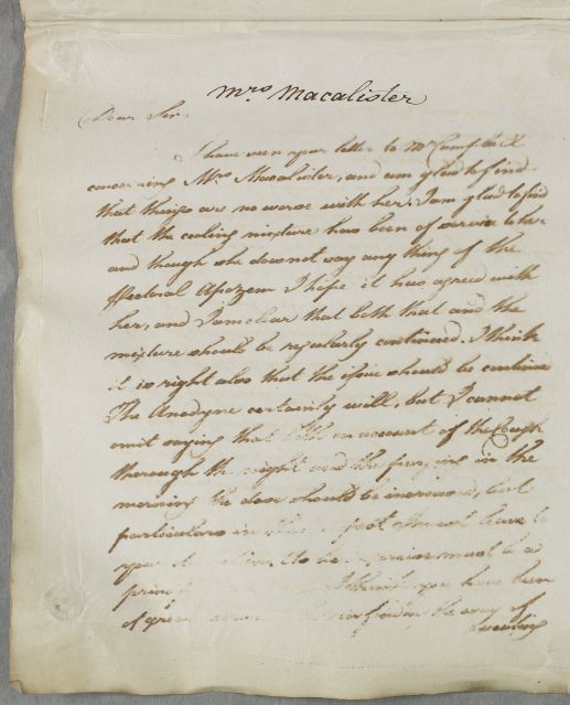 | Summary | Letter concerning the case of Mrs McAlister; Cullen refers to a letter written by the addressee to Mr Campbell about the case. |