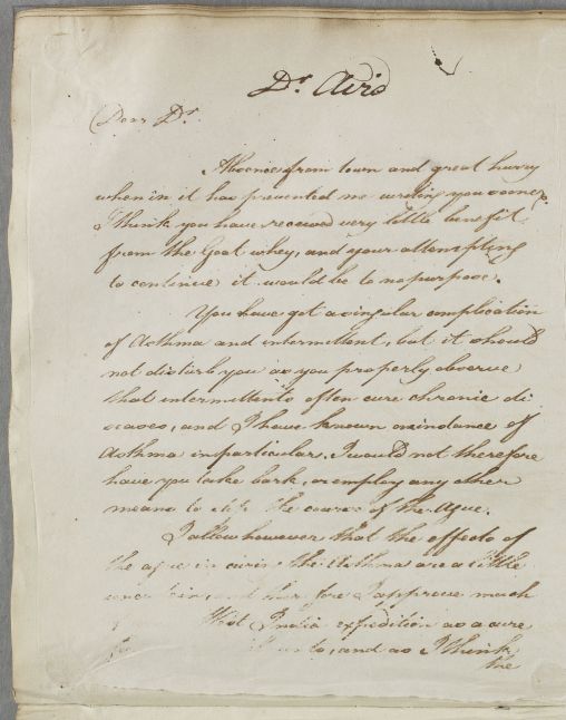Case of Dr John Aird of Sterling, who has 'fits' of asthma. He first consulted Cullen in person at Edinburgh. |
