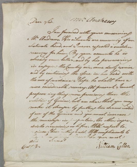[ID:5542] From: Dr William Cullen (Professor Cullen) / To: Mr John Jack / Regarding: Reverend William Andrews (of Woodsyde) (Patient) / 3 October 1787? / (Outgoing)