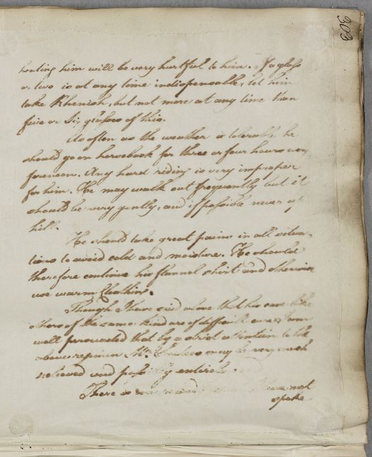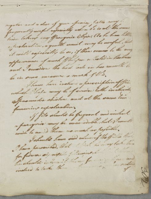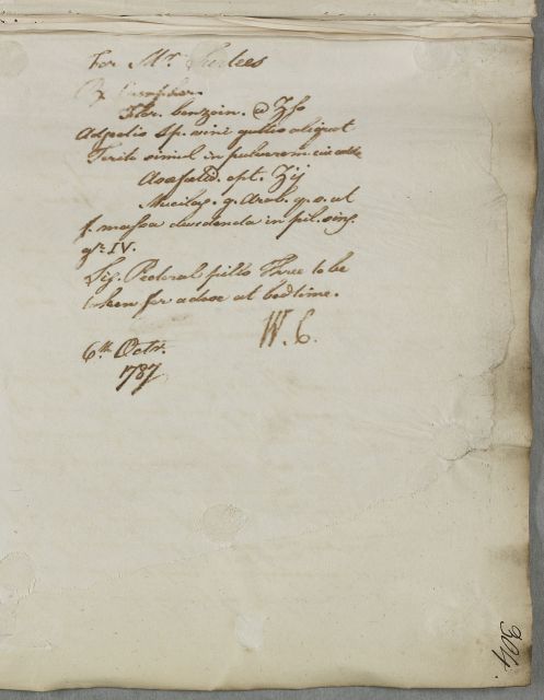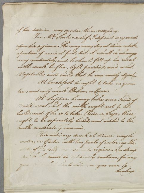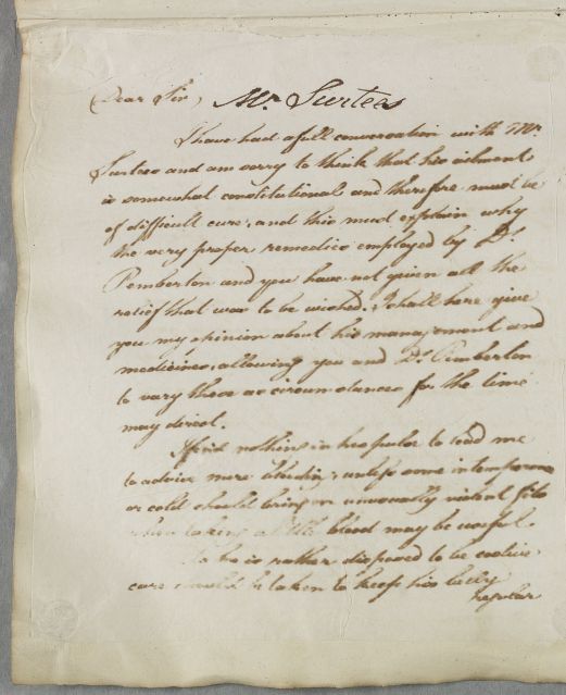 | Summary | Letter to William Ingham, with a regimen and prescription for John Surtees, whom Cullen has recently seen in person. He writes, 'his ailment is somewhat constitutional and therefore must be of difficult cure'. He is given dietary and exercise advice and guidance on bleeding and blistering, as well as a prescription for pectoral pills. See note to Letter 5732 linked to this case, which implies that this document got left in Edinburgh error. |