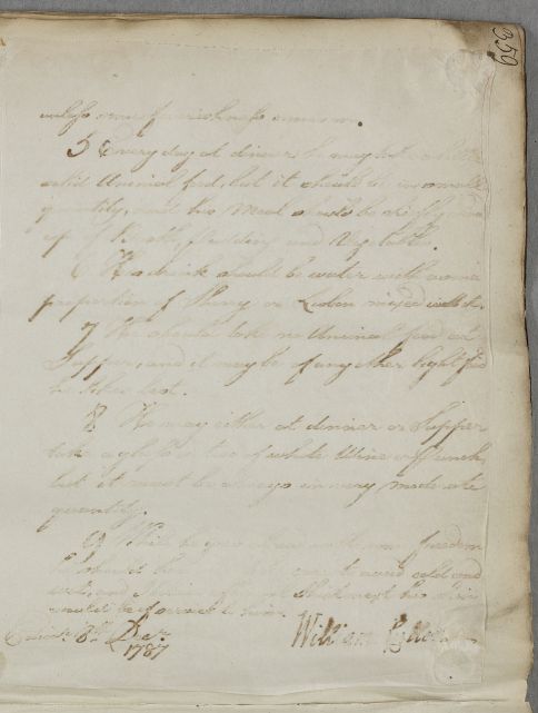 Reply headed 'For Captain Weemyss' (i.e. Wemyss). A short, numbered regimen, with a recipe for Cephalic Pills and recommendation to wear a flannel shirt. The opening 'As soon as he is a day settled at home' may suggest that he has been to visit Cullen in person. Destination guessed from the fact that the majority of the Wemysses are based in Fife. Quite poor copy.