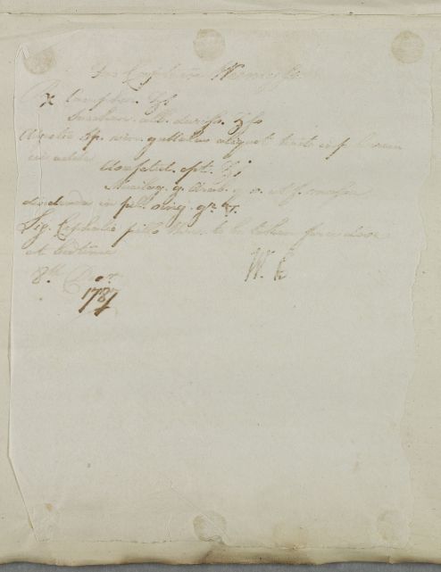 | Summary | Reply headed 'For Captain Weemyss' (i.e. Wemyss). A short, numbered regimen, with a recipe for Cephalic Pills and recommendation to wear a flannel shirt. The opening 'As soon as he is a day settled at home' may suggest that he has been to visit Cullen in person. Destination guessed from the fact that the majority of the Wemysses are based in Fife. Quite poor copy. |