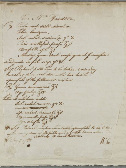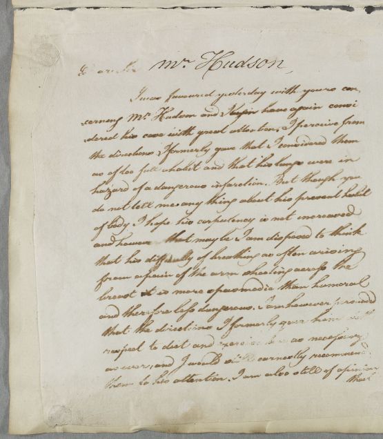 | Summary | Reply to William Ingham, concerning the case of Mr Hudson. Cullen hopes 'his corpulency is not increased'. He believes the pains shooting from his arm across his chest are 'more spasmodic than humoral and therefore less dangerous', but advises him to use the medicines and regimen prescribed in 1784, and attaches further pectoral prescriptions. He also asks about a female patient: 'I am afraid you had no good to tell me with respect to Miss Bell, but I wish you had told me her state whatever it is'. |